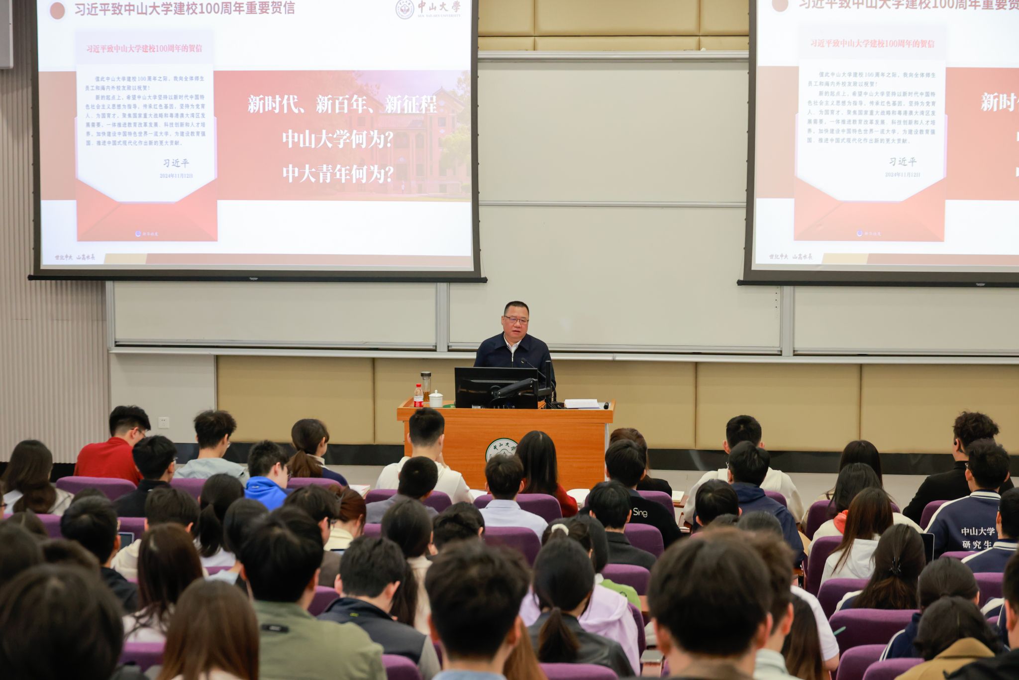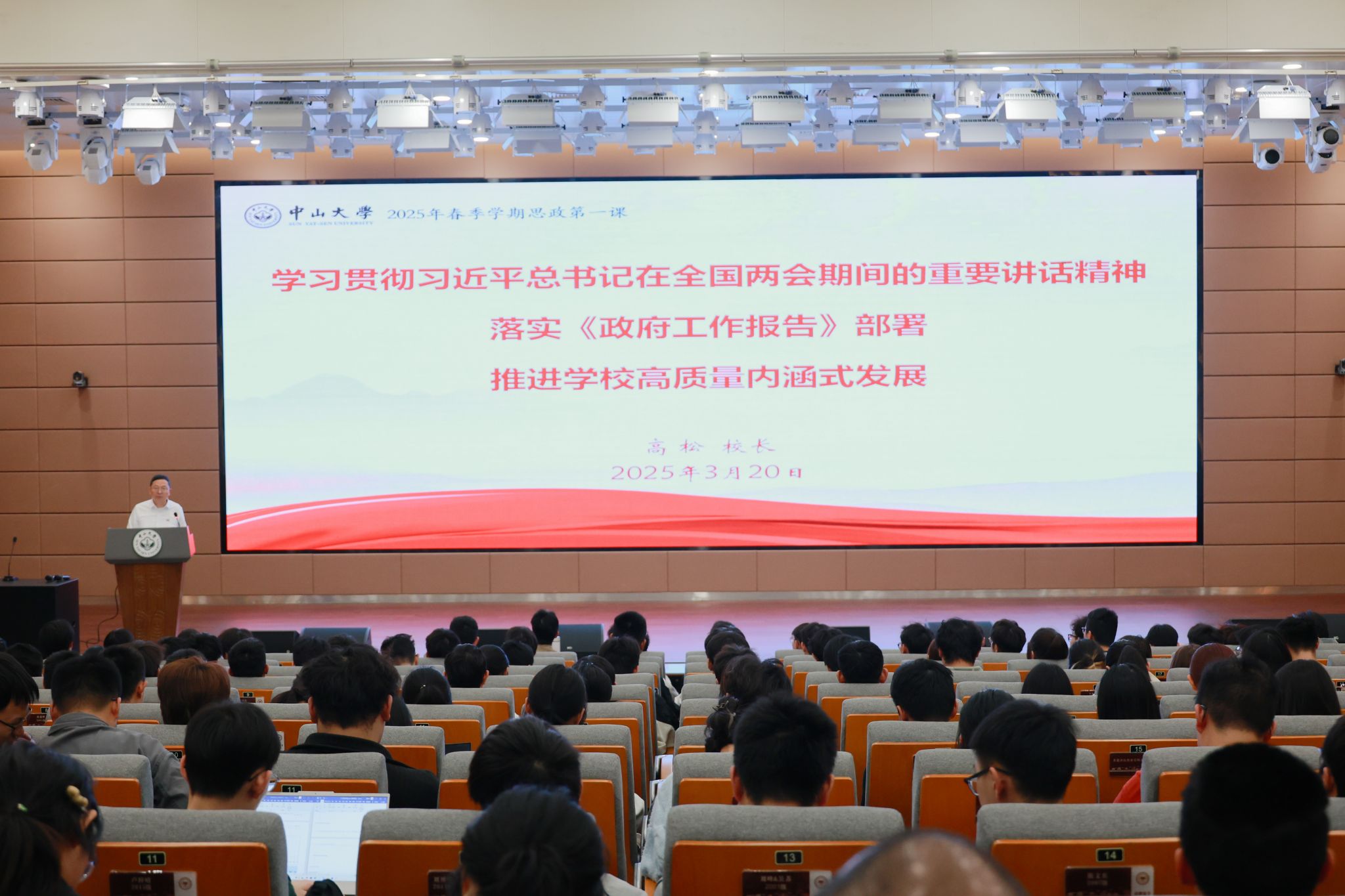 中大新闻网讯(记者邱清萌)3月20日下午,bat365在线中国登录入口广州校区南校园生命科学学院国际会议厅座无虚席,来自物理学院、社会学与人类学学院、生态学院、土木工程学院等院系的160多名本科生、研究生和来自学校各机关党支部(党总支)的100多位支委及青年党员代表齐聚一堂,正聚精会神地聆听着他们这个学期的思政第一课。讲台上,bat365在线中国登录入口校长高松院士正在传达全国两会的最新精神。“今年的全国两会十分重要,‘十四五’规划即将收官,...