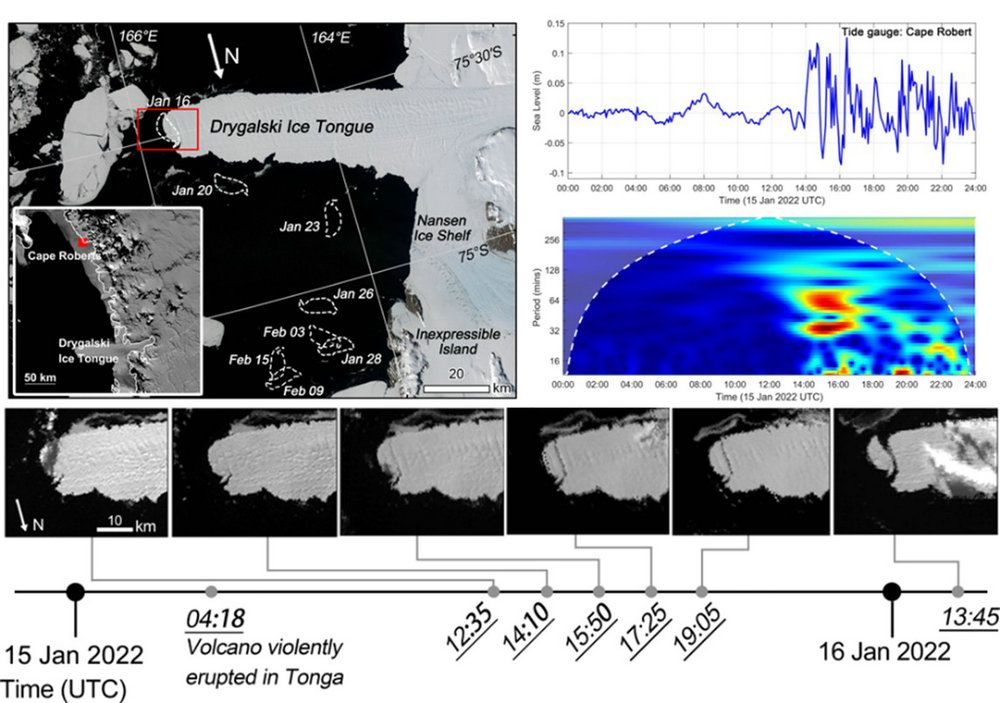 Researchers from the School of Geospatial Engineering and Science in Sun Yat-sen University have disclosed that a tsunami triggered by last year's Hunga Tonga volcanic eruption caused the calving of the Drygalski ice tongue front in the South Pole, according to a recent research article published in the journal Science Bulletin.