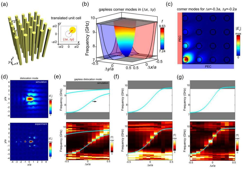 To solve this problem, Professor Jian-Wen Dong and Prof Wen-Jie Chen from the School of Physics at Sun Yat-sen University reviewed the existing work in higher dimensional space and found that people used to realize topological photonic crystals in momentum space. However, the dimension of momentum space is generally consistent with that of real space, which greatly hindered the exploration of topological modes in high dimensional space. Inspired by synthetic dimension and four-dimensional quantum Hall effect, they constructed a second Chern crystal in four-dimensional space by introducing two additional synthetic translation dimensions and combining two momentum dimensions (Figure 1(a)). Different from the first Chern number in two-dimensional space, the second Chern number is the topological invariant that characterizes the topological properties of crystals in four-dimensional space. Through rigorous derivation and detailed numerical calculation, they found that the second Chern number of each independent band in the four-dimensional abstract space is identical to 1, which confirms the intrinsic nontrivial topological property of this second Chern crystal. Furthermore, the localized boundary modes can be obtained when the second Chern crystal is truncated. In particular, when dimensionality truncation is carried out with PEC boundary in both x and y directions, gapless localized corner modes can be observed (Figures 1(b)&1(c)). Note that the existence of this gapless corner modes does not depend on crystal symmetry, and thus provides a generalized scheme to achieve localized modes in arbitrary crystal structure. In addition, the frequency of corner modes covers the whole band gap, which is also important for the flexible design of topological photonic devices. On the other hand, dislocation is a common real space crystal defect, which can also support localized modes. By projecting a four-dimensional space into a one-dimensional space through dimensional reduction, a one-dimensional topological dislocation mode is found. Specifically, after fixing the transverse translation Δx for each cylinder in the unit cell, and establishing the linear relationship between the longitudinal translation Δy and the azimuth angle θ, the dislocation characterized by the Burgers vector can be obtained, which can realize localized modes without relying on the PEC boundary (Figure 1(d)). Furthermore, the topological dislocation mode can construct a one-dimensional vortex pattern after considering all possible Δx (Figure 1(e)). In particular, this topological dislocation mode dispersion persists even after the introduction of additional defects, proving its robustness (Figures 1(f)&1(g)).
