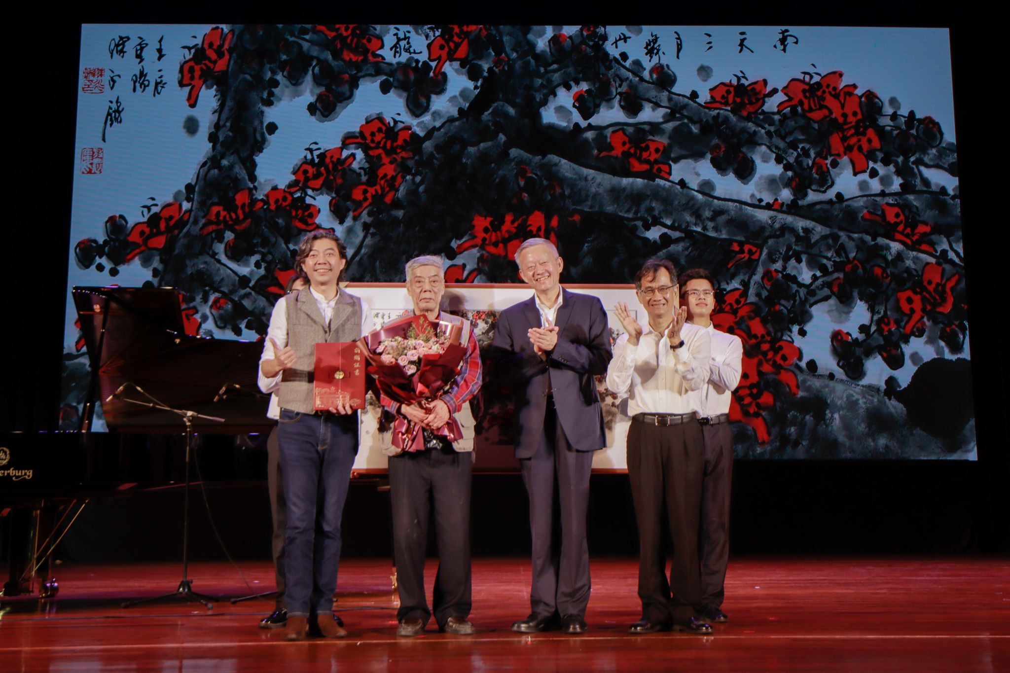 Chen Yongqiang, a master of Chinese arts and representative of Lingnan Painting School, donated a traditional Chinese painting created by himself to the university. The painting is named “Nan Tian March Dance Dan Long”, literally meaning the dancing red loong in Ling Nan Area (South China) in March, on which kapok is in full bloom and luxuriant, expecting that Sun Yat-sen University can continue to thrive.