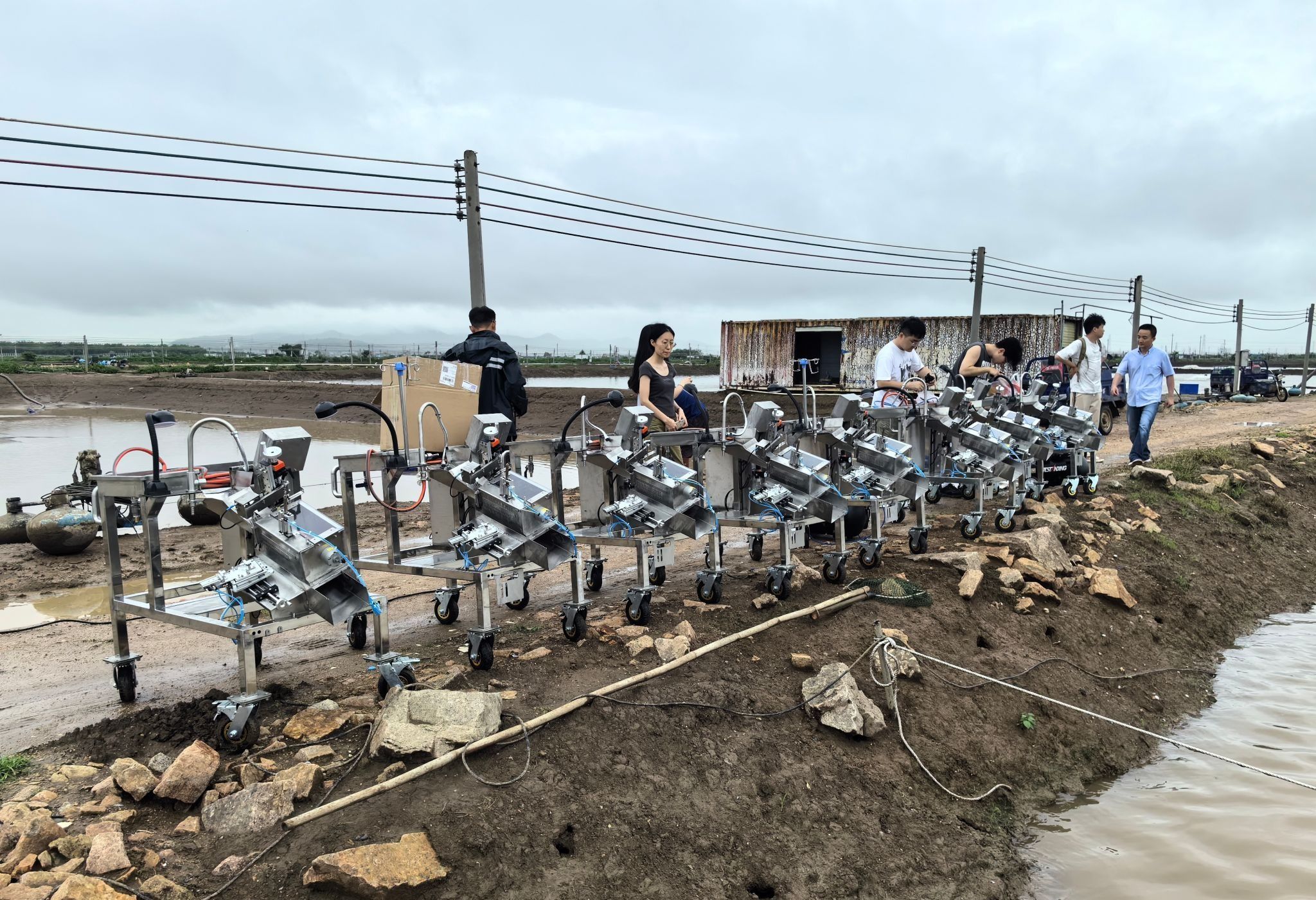 Researchers operate automated fish vaccine injection equipment to administer vaccines to sea bass fry at a marine ranching base.