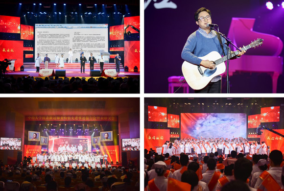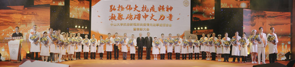 The meeting was divided into four chapters namely “Solidarity”, "Sacrifice”, "Sense of Mission for Humanity” and “Putting Lives First’. Representatives of model groups and individuals shared their stories on site. Guan Xiangdong, one of the “eight nationwide renowned specialists on intensive care” from SYSU’s First Affiliated Hospital, who was helping on the anti-epidemic front line in Kashi, Xinjiang, met the audience via video connections. The touching stories of SYSUers fighting COVID-19 across the country and even worldwide won bursts of applause from the audience, and many were moved to tears.
