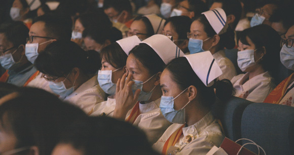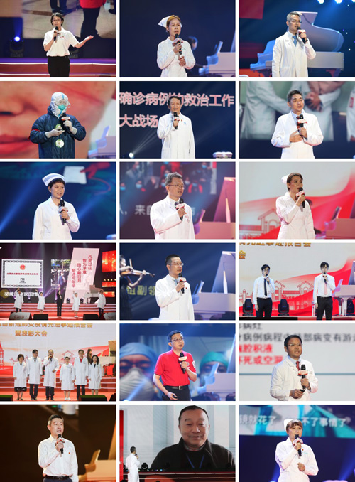 We Are China, We Are A Family. On the stage the scenes were reconstructed showing SYSU medical workers taking the initiative to fight on the front line at the beginning of the COVID-19 outbreak, and joining the CPC on the front line of the fight against the epidemic. All Party members at the meeting took Party admission oath. The meeting ended with participants singing together