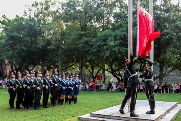 At 8:00 am, the national flag-raising ceremony started. The students of the national flag guard class escorted the bright five-star red flag to the flag-raising platform. All faculty and student representatives sang the national anthem and watched the national flag rising.