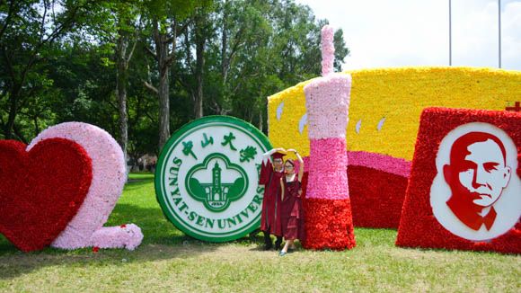 Associate Professor Yao Youyi, who designed the SYSU emblem, is also the designer of this year’s flower wall. He combines the elements of the number “2”, SYSU emblem, Canton Tower, and a portrait of Dr. Sun Yat-sen to create the shape of “2018”. In addition, when the graduate stands on the left side, together with the heart shape and the university emblem, they will form a picture of “I love SYSU”.