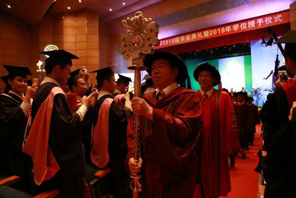 As Professor Huang Tianji held the scepter and entered the K.K. Leung Hall on Guangzhou South Campus, the graduates turned their eyes on the scepter, cheering and clapping.