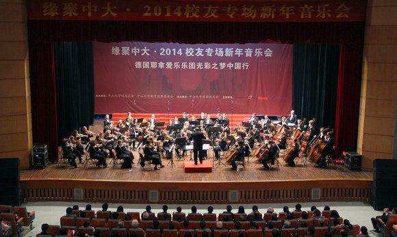 On the afternoon of December 14, the “Gathering at SYSU 2014 Alumni New Year’s Concert” — Jenaer Philharmonie Concert Tour in China was held in K.K. Leung Hall on South Campus. The Concert was hosted by SYSU Alumni Association and SYSU Education Development Foundation, and organized by SYSU Alumni Association of Germany. Li Ping, Deputy Secretary of SYSU Party Committee, Executive Vice President of SYSU Alumni Association and Vice President of SYSU Education Development Foundation, attended and addressed the concert. Chen Shaobin, Assistant President of SYSU, Dr. Albrecht Schröter, Mayor of Jena, Mr. Frank Jauch, Deputy Mayor of Jena, and Dr. Wu Minzhi, President of SYSU Alumni Association of Germany, attended the concert. Nearly 1,500 SYSUers gathered together to enjoy the concert and celebrate the coming New Year.