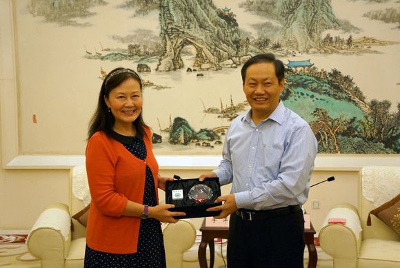 Deputy Secretary Li Ping (left) presenting SYSU souvenir to alumnus Peng Qinghua (right)