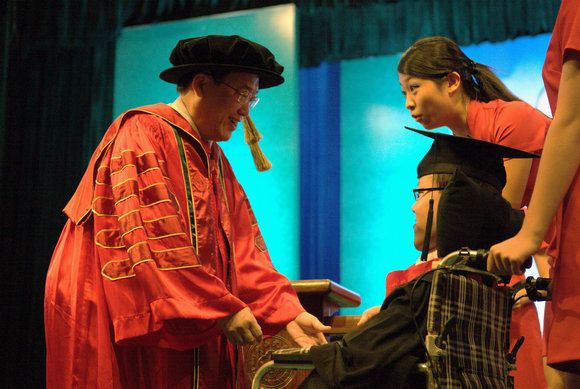 At the second session of the commencement held on the morning of June 27, Li Naiqi, sitting in his wheelchair, was the first student to receive the Bachelor’s Degree. In 2009, he excelled in the National College Entrance Exam and was enrolled in the School of Information Science and Technology. He once said: “Choosing computer as my major is to break through the limit of human being.” Now he has been accepted into the postgraduate program at SYSU and will attend the IJCAI as first author in August.