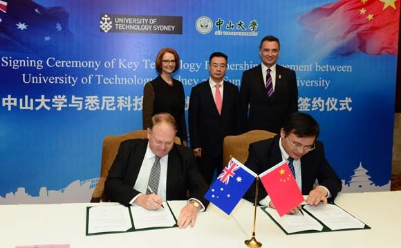 On April 9, witnessed by Australian Prime Minister Julia Gillard, Sun Yat-sen University (SYSU) signed the Key Technology Partnership agreement with University of Technology, Sydney (UTS) in Beijing. The agreement was signed by SYSU Vice President Yan Guangmei and UTS Vice-Chancellor Ross Milbourne. Australian Tertiary Education Minister Craig Emerson, Chairman of Kingold Group Companies Limited Dr Chau Chak Wing, Australian Ambassador to China Frances Adamson, Director of International Engagement of UTS Leo Mian Liu, and Director of Office of International Cooperation & Exchange of SYSU Ling Wenhua also attended and witnessed the signing ceremony.