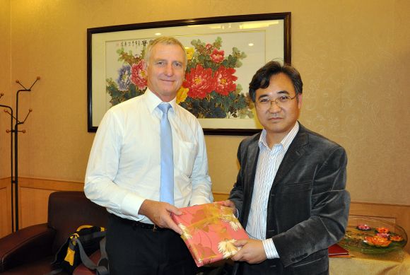 Assistant President Zhu Xiping and Professor Greg Skilbeck exchanging gifts