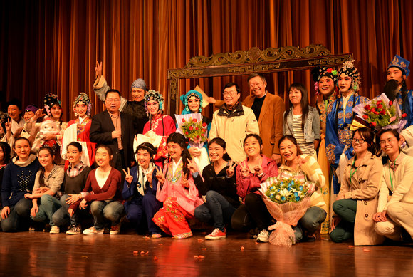 At half past seven in the evening, there was already no empty seat in the K.K. Leung Hall. Ever since the beginning of the show, the lively yet peaceful singing and the agile yet graceful movements gained acclamations from the audience again and again. At the end of the show, some audience were even singing together with the actor the part “It is this that is unexpected. Unforeseen as the reunion took place today…”, pushing the performance to a climax. In thunderous applause over and over again, "The Kylin Bag" ended with great success. After the performance, President Xu Ningsheng, Executive Deputy Secretary and Vice President Chen Chunsheng, and Deputy Secretary Zhu Kongjun went up to the stage and had photos taken with the performers. Many audiences said it was the first time for them to enter the theatre and to have a close contact with Peking Opera. They felt completely overwhelmed by the beauty of our national quintessence, and looked forward to more performances like this.
