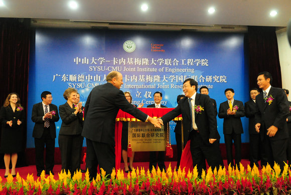 The two institutes, thanks to the dedicated and vigorous support of Ministry of Education, National Development and Reform Commission and other departments of the State, the People’s Government of Guangdong Province, the Guangzhou Municipal Government, the Foshan Municipal Government and the People’s Government of Shunde District, Foshan City, are now successfully established, documenting another major event in international cooperation in China’s higher education. The preliminary talks on potential cooperation between SYSU and CMU started in October, 2009. On November 14, 2011, SYSU and CMU signed a cooperation agreement to set up a “Joint Institute of Engineering” and its subsidiary “School of Electronic and Computer Engineering”. To support the establishment of the SYSU-CMU Joint Institute of Engineering and the SYSU-CMU Shunde International Joint Research Institute, Guangzhou Municipal Government and the People’s Government of Shunde District, Foshan City, signed cooperation agreements with SYSU and CMU to support such great efforts respectively. The cooperation project was approved by the Ministry of Education recently.