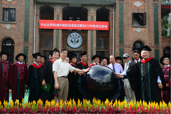 Xu Ningsheng, President of SYSU, Yu Shiyou, Deputy Secretary and Secretary of Discipline Inspection Commission, Li Ping, Deputy Secretary of SYSU Party Committee, Lei Shangbin, Honorary President for Life of the Alumni Association of Sun Yat-sen University of Medical Science on East Coast, U.S., Huang Duanyi, President of the Alumni Association in Toronto, Canada, Chen Pingyuan, President of the Alumni Association in Beijing, Guan Weide, Vice President of the Alumni Association in Australia, Gao Wen, former President of the Alumni Association on East Coast, U.S., Jin Chaohong, Vice President of the Alumni Association in Hong Kong, Wang Jianmao, Vice President of the Alumni Association in Shanghai, and teacher representatives launched the 90th anniversary celebrations of SYSU together.