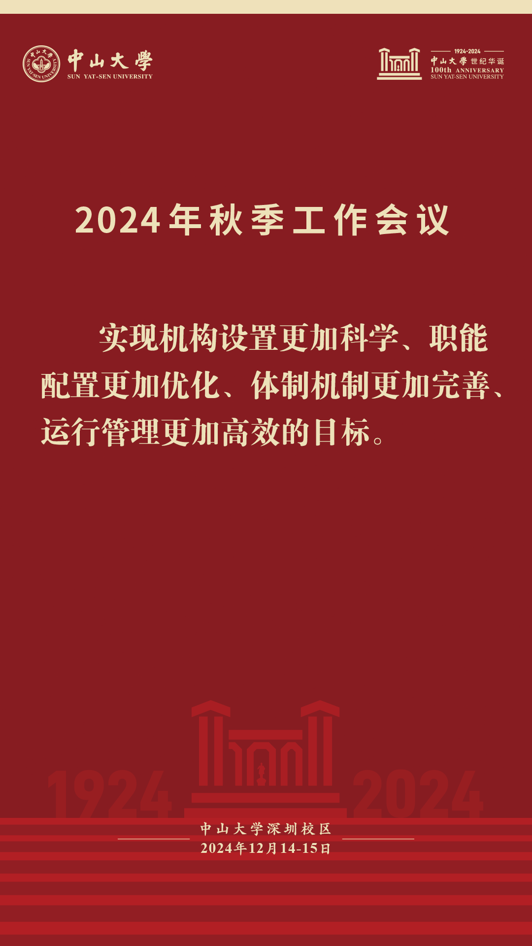 本次秋季工作会议为期两天。在后续的议程中,14日下午教务部、研究生院、科学研究院、人力资源管理处负责人进行专题报告,发展规划办公室、财务处、总务部、政治与公共事务管理学院、数学学院、中山医学院、地球科学与工程学院、先进制造学院负责人代表机关部处和院系围绕完善内部治理体系进行发言。14日晚上与会人员按学部分组讨论。15日上午,各分组召集人代表将结合大会报告、分组讨论情况在会上发言。