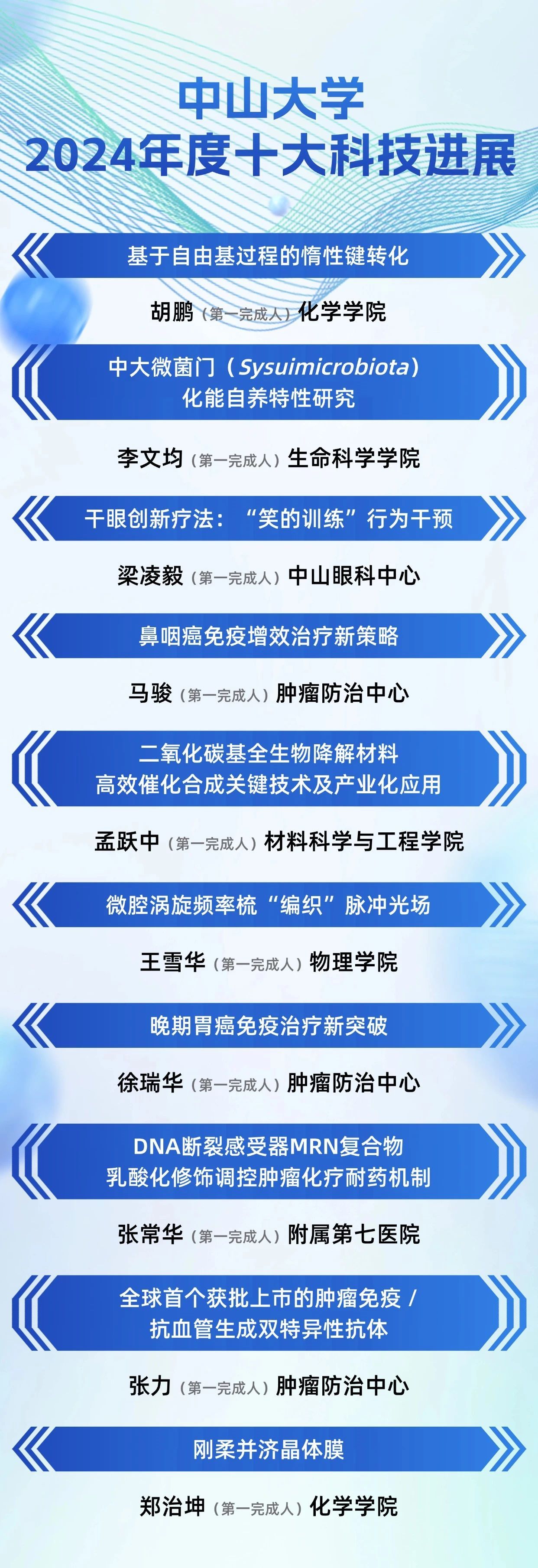 会上公布了bat365在线中国登录入口2024年度十大科技进展,10项成果分为基础研究、应用研究和科技转化三大类别,覆盖肿瘤、眼科、物理、化学、材料、微生物等多领域前沿研究,相关成果在世界顶级期刊发表或已在业界开始应用。