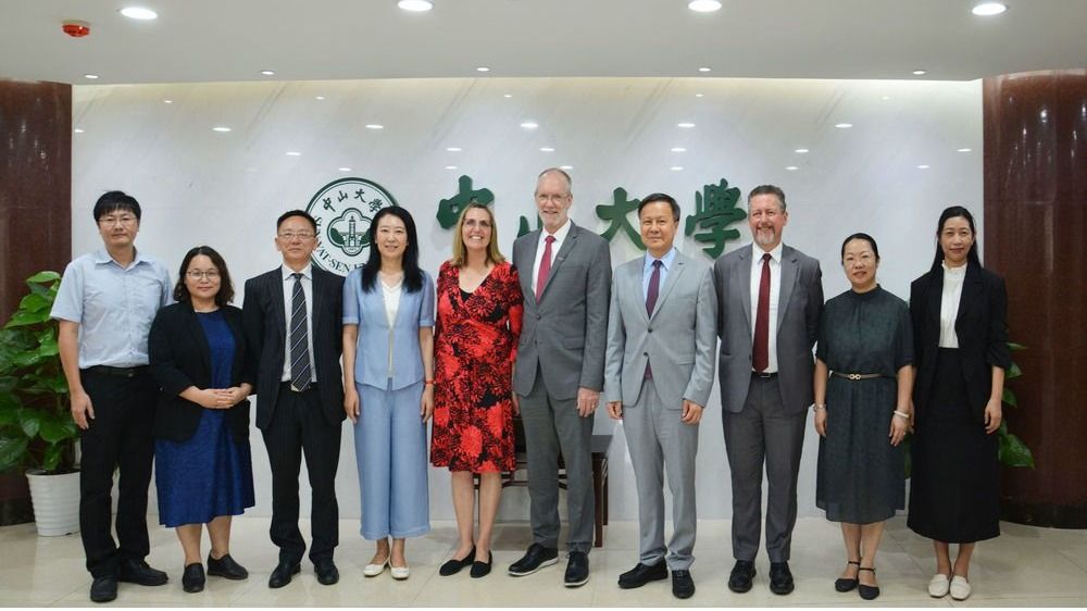 From June 20 to 21, a delegation from the University of Nevada, Las Vegas (UNLV) led by Executive Vice President Chris Heavey visited Sun Yat-sen University (SYSU). SYSU Executive Vice President Xiao Haipeng met with the guests in the VIP room of Zhongshan Building on Guangzhou South Campus. Representatives from the Department of Chinese, School of Art, School of Tourism Management, and Office of International Cooperation & Exchange attended the meeting.
