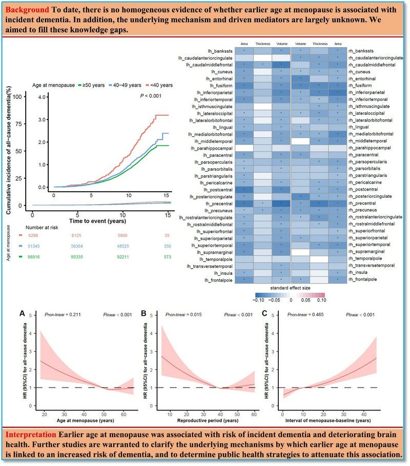 Emerging evidence has shown that reducing modifiable risk factors may help to prevent and control dementia. Earlier menopause, particularly premature menopause, might be associated with increased risks of cardiovascular diseases, sleep disorders, psychiatric diseases, and other sequelae. It is uncertain whether earlier age at menopause is associated with incident dementia. In addition, the underlying mechanism and driven mediators are largely unknown.