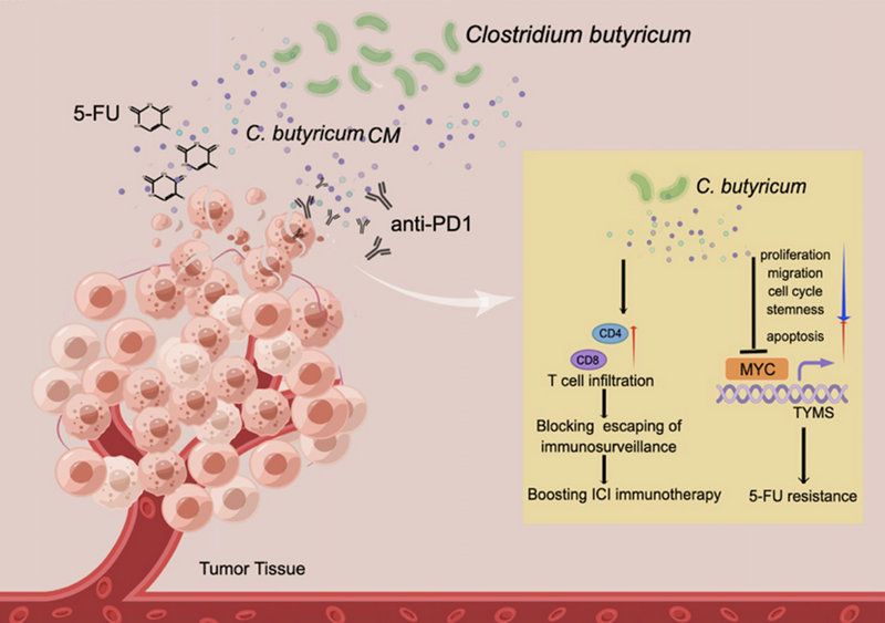 Schematic summary of C.B's role in modulating 5-FU drug resistance and boosting anti-PD1 immunotherapy.