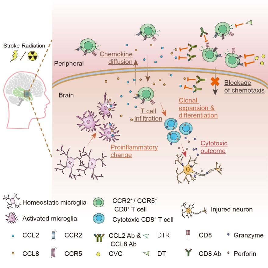 Overall, this study demonstrates for the first time that after exposure to radiation or cerebral ischemia insult, microglia secret chemokines CCL2 and CCL8, which then attract peripheral CD8+ T cell infiltration and the release of cytotoxic factors such as perforin and granzyme that cause brain injury. This study also provides a new therapeutic approach to treating RIBI and ischemia by targeting T lymphocyte-mediated adaptive immunity.