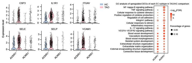Analysis of endothelial cells (ECs) showed that atypical chemokine receptor 1+ (ACKR1+) ECs were significantly increased in TAO, and highly expressed adhesion molecules, selectin and chemokines. Further functional analysis showed that ACKR1+ ECs played an important role in the process of immune cells infiltration. Therefore, the researchers proposed that ACKR1+ ECs may also be involved in the pathogenesis of TAO. (FIG. 4)