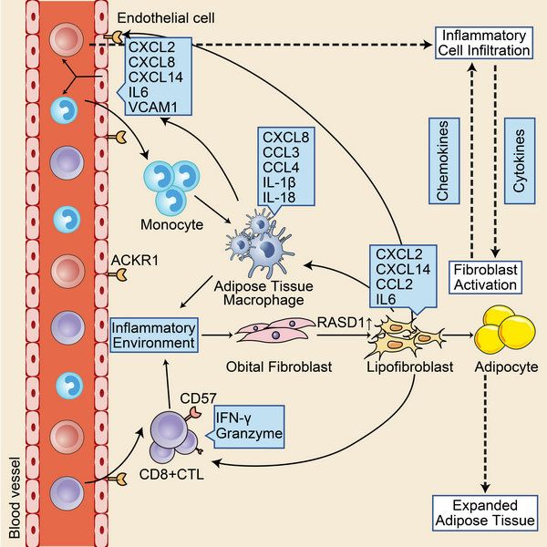 Thyroid associated ophthalmopathy (TAO) is an autoimmune condition affecting the orbit and ocular adnexa that may lead to vision loss. Treatment for TAO remains challenging because of the poor understanding of its pathogenesis. On July 26, 2022, Prof. Wenru Su's group from Zhongshan Ophthalmic Center of Sun Yat-sen University recently published their results in Cell Reports Medicine, which revealed the immune microenvironment at the single-cell level in orbital tissues of thyroid associated ophthalmopathy, and provided a new direction for exploring potential therapeutic targets of TAO.