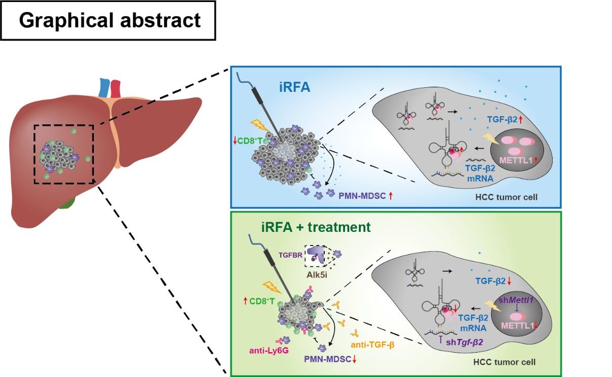 Insufficient RFA promoted METTL1-mediated TGF-β2 translation,which induced PMN-MDSC accumulation and reduced CD8+T cell infiltration. Targeting the METTL1-TGF-β2-MDSC axis significantly ameliorated residual HCC progression.