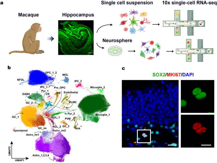 This study provides a comprehensive cell atlas of adult primate neurogenesis. Optimized immunofluorescence staining and in vitro culture of neural precursor cells further confirmed the existence of active neurogenesis in the hippocampus. These results provide important medical insights for promoting adult neurogenesis and recovery of damaged nervous systems, such as visual impairment, movement disorders, and memory loss.