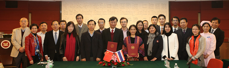 On January 19, 2016, the signing ceremony of the agreement for collaborative program between Faculty of Dentistry, Khon Kaen University (KKU) and Guanghua School of Stomatology·Hospital of Stomatology, Sun Yat-sen University (SYSU) was held at the Conference Center in Hospital of Stomatology, SYSU. The delegation led by Associate Professor Dr. Waranuch Pitiphat, Dean of Faculty of Dentistry, KKU, leaders of Guanghua School of Stomatology, and faculty members from the Department of Oral and Maxillofacial Surgery attended the signing ceremony.