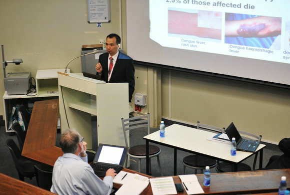 Dr. Yiping Li from Zhongshan School of Medicine (ZSSOM) and Institute of Human Virology at Sun Yat-sen University (SYSU) was invited to give a presentation entitled “Viral pandemics and non-traditional security of globalization - examples of Flaviviridae viruses” in the colloquium. Taking Dengue virus (DENV) and hepatitis C virus (HCV) as examples, Dr. Li described to the audience the pathogenesis, epidemiology, viral spread, and current research on genetics background, treatment and prevention of these two important human pathogens. Dr. Li pointed out that the impact of DENV and HCV has been underestimated, and globalization and associated human activities are contributors in the current and ongoing global transmission of viruses, thus imposing non-traditional safety issues to world population. Therefore, international coordinated efforts are now essential for the reduction of the transmission of these viruses, and for the promotion of human health. This talk triggered great interest and stimulated discussions among the audience.