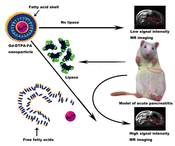 For the above scientific problems, Professor Deng Yubin’s team adopted the strategy of lipase enzyme activation and synthesized a conditionally activated, gadolinium-containing, nanoparticle-based MRI nanoprobe (Gd-DTPA-FA) as a diagnostic tool for the early identification of AP, which exhibited low cytotoxicity and excellent biocompatibility