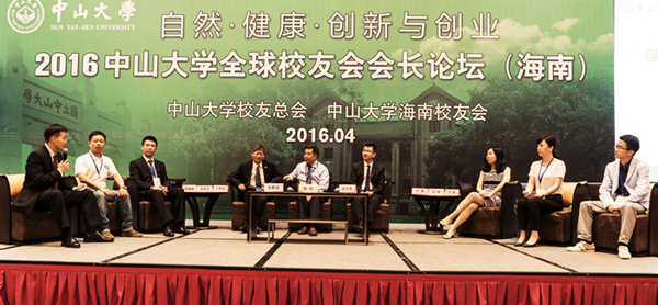On the morning of April 9, the 2016 SYSU Alumni Association Presidents Forum, with the theme of “nature · health · innovation and entrepreneurship”, was held in Haikou, Hainan Province. Prof. Luo Jun, President of Sun Yat-sen University (SYSU) and President of SYSU Alumni Association, Prof. Li Ping, Deputy Secretary of SYSU Party Committee and Executive Vice President of SYSU Alumni Association, Mr. Chen Shaobin, Assistant President of SYSU and Executive Director of SYSU Alumni Association, as well as presidents of SYSU alumni associations around the world, representatives from SYSU Entrepreneurs Alumni Association, and some SYSU alumni in Hainan, attended the forum.