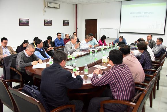 University leaders and administrative department directors have a meeting with leaders and faculty members of the School of Data and Computer Science.