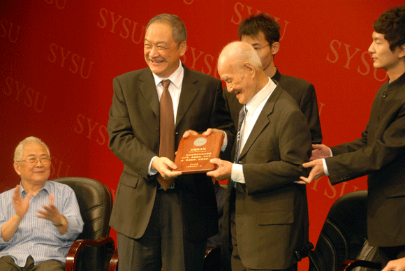 Zhen Detao, the Secretary of the Party Committee of SYSU, awarded the prize to Professor Fu Jiarui.
