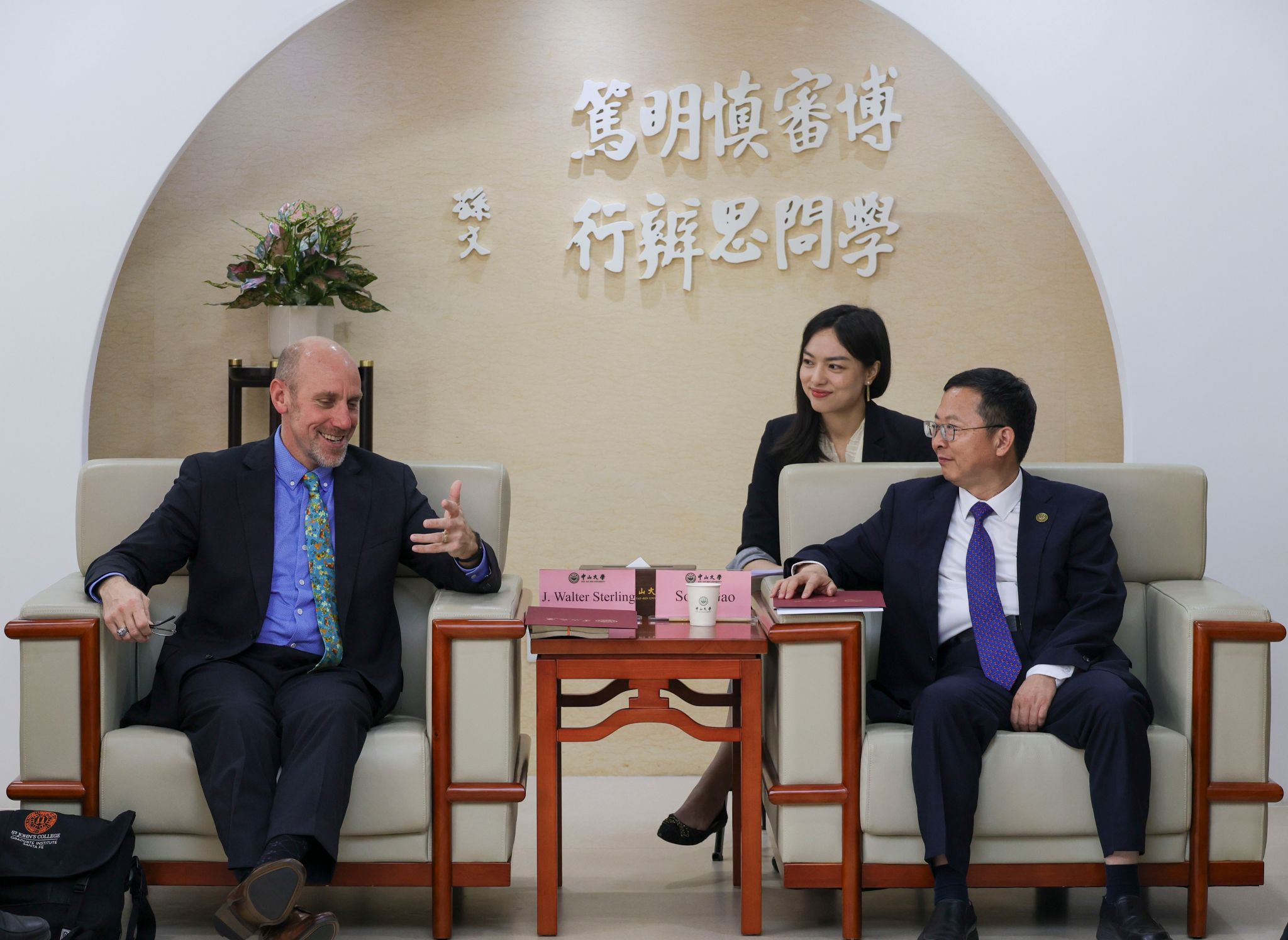 Gao Song, president of SYSU, extended a warm welcome to President J. Walter Sterling on his visit to Sun Yat-sen University on the occasion of the 100th anniversary of the university, and introduced the university's development in recent years. Gao highlighted the decade-long partnership between Boya College of SYSU and St. John's College. He hopes that the two sides will continue to deepen exchanges and cooperation to promote integration of liberal arts education and professional education.