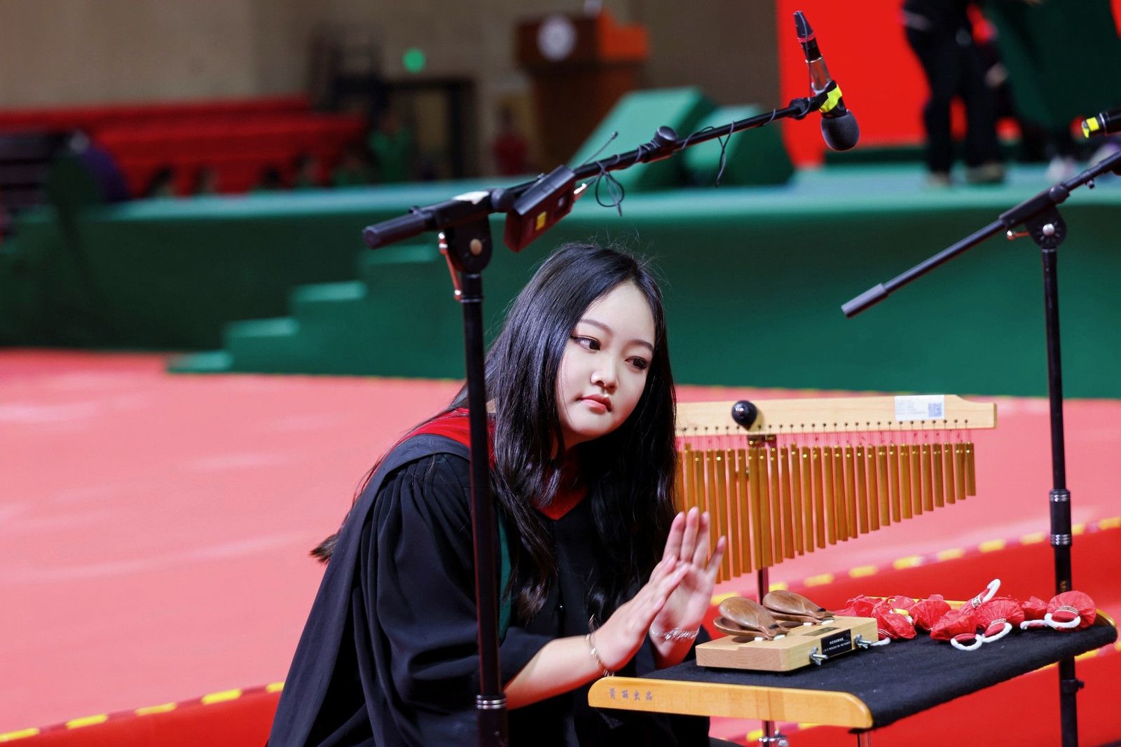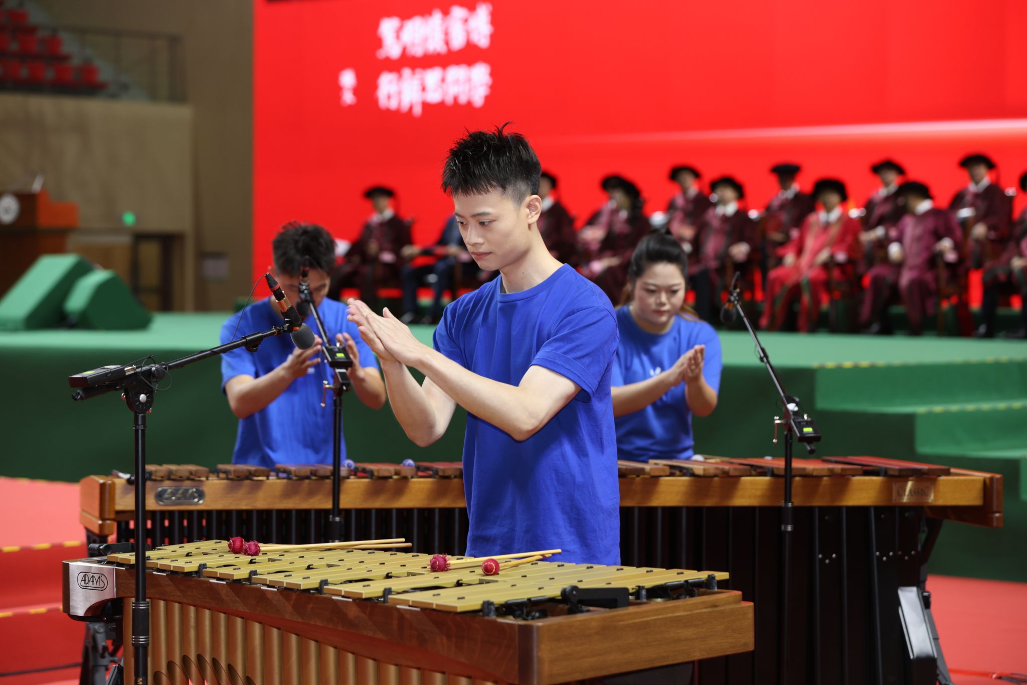 At the ceremony, SYSU Azure Percussion Ensemble performed the percussion piece Song of Valencia. Following this, a vibrant medley of graduation-themed songs echoed through the venue, including the graduation song for the Class of 2025 A Letter to You, igniting the air with applause and nostalgic resonance.