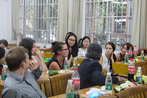 At the meeting held on South Campus of SYSU, Ms. Yang and Prof. Pachlaner respectively introduced SYSU and CU. They reviewed the past cooperation between the two institutes and expressed the hope for future collaborations. Later, students from both sides started a seminar in which six groups of students delivered various speeches about different topics in tourism, after which all the students and teachers joined together for a discussion. The topics of speeches given by the three groups of German students were: “What makes German tourism successful?”, “The Integration of tourism and industry” and “Health Tourism”; Ms. Chen and two students Kou Lirong and Zhuo Shaobing presented a talk respectively on “The development characteristic and influential factors of Canton Fair’s green exhibition: A perspective from knowledge diffusion”, “The integration of Tibetan retired migrant”, and “Heritage responsibility: content and subjects”. Afterwards, the teachers and students made comments or raised questions.