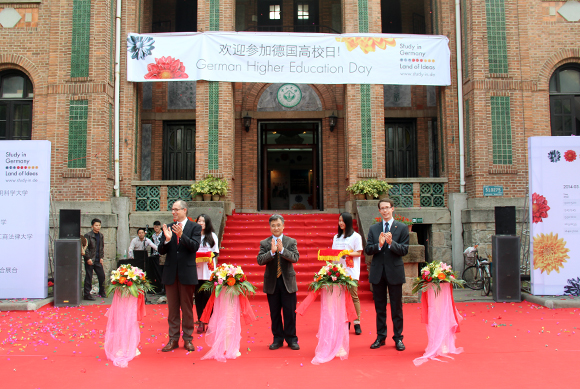 On March 13-14, the “2014 German Higher Education Day” was held in Swasey Hall on South Campus of SYSU. Representatives from 12 German universities and institutions participated in the event. On the afternoon of March 13, the opening ceremony was held in Swasey Hall. Professor Zhu Xiping, Vice President of SYSU, Mr. Jochen Ulrich Kuenzel, Consul of Consulate General of the Federal Republic of Germany in Guangzhou, and Dr. Thomas Schmidt-Doerr, Director of DAAD Branch Office Beijing, attended the ceremony and delivered a speech.