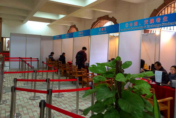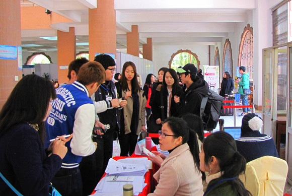 For the last few years international students had to queue for a long time to complete all the registration procedures due to the limited spaces of the site. This spring, the Office for International Students’ Affairs (ISAO) of the University tried every effort to improve the situation. After careful design and planning, ISAO decided to switch the registration to the building of the School of Foreign Languages (FLS) where a spacious and comfortable site was offered. The professional installation was introduced for the design and arrangement of all the registration procedures and detailed instructions were placed from the university gate to many points around ISAO to FLS. On the registration site, a big conference room was available for students to fill in the registration forms, to watch the introduction slides of the University and to take a rest in the cold winter days. In the waiting area, water, chairs and Wifi were also offered, which brought a relaxing, warm and comfortable registration site for the students who come from afar to study in the University. Besides, around 50 students were recruited as volunteers to help ensure the smooth and efficient processing of the registration.