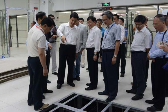 First, Mayor Chen Jianhua visited the hall on the first floor of GSC building and listened to a report on the construction of GSC. He affirmed the work of various construction units and encouraged them to work hard to accomplish the task. Then, the mayor came to the computer room on the second floor and visited the technicians from NUDT. He shook hands with them one by one and asked about their work and life in Guangzhou. He encouraged everyone to make a concerted effort to create a miracle in Guangzhou, make contributions to the construction of GSC and Guangzhou, and gain brilliant achievements in supercomputing in China.