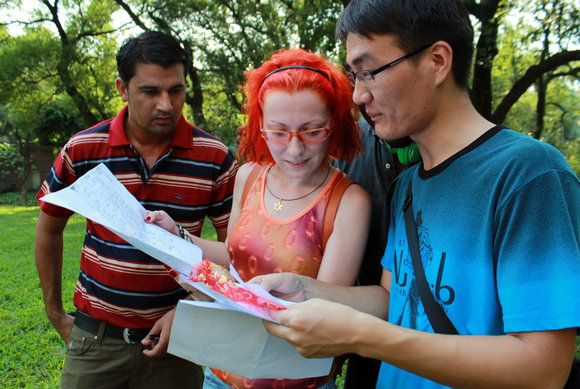 International students and Chinese volunteers studying the campus map together