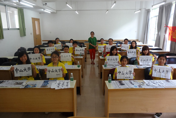 Afterwards, the campers took the calligraphy class and learned to write with brush pen to experience the traditional Chinese culture. The teacher introduced to the campers about the calligraphy culture, the “scholar’s four jewels” and the standard writing posture, and taught them to practice writing the dot, the horizontal stroke, the vertical stroke, the downward left and right strokes, which are the basic skills of calligraphy. They tried writing “Sun Yat-sen University” in Chinese on light-yellow rice paper with great interest.