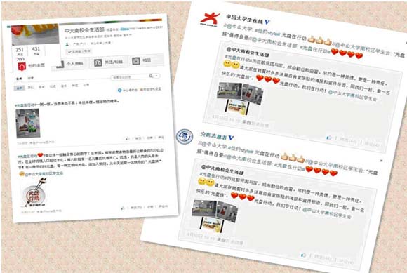 Specifically, the campaign included putting up tips in dinning halls and food pick-up windows to remind students to reasonably order meals and cherish food. The forms of the campaign ranged from traditional physical posters, slogans and exhibition boards to modern communication channels such as Weibo and WeChat. During the activity, the “clear you plate” microblogs posted at SYSU were also forwarded by some universities and external institutions.