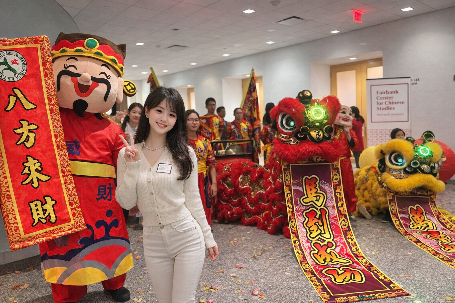On Harvard University, we welcomed the Chinese New Year with a vibrant lion dance. As the rhythmic beats of gongs and drums rang out, the red-and-yellow lions head twirled and leaped through the corridors. Scrolls with blessings—Ma Dao Cheng Gong (blessing someone with immediate success) and Wan Shi Ru Yi (everything goes as you wish)—were gently unfurled, and the familiar warmth of Spring Festival filled this foreign land.
