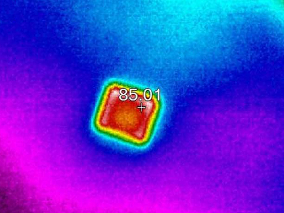 Thermal images show the difference in solar radiation absorbed by a bare silicon wafer (left) and a Te nanoparticle (right).