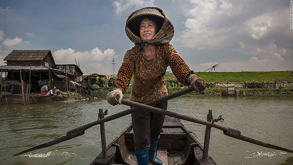 Chen Shourongon paddles her boat on Shazai Island, where the field release program is underway.