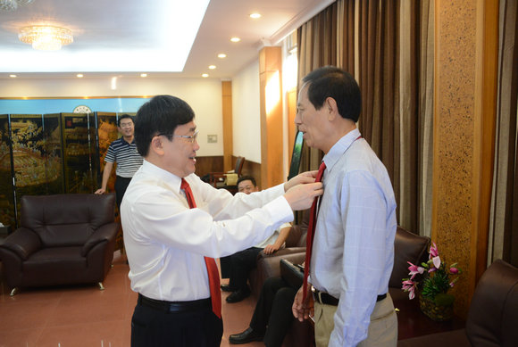 President Xu Ningsheng adjusting the tie for Prof. Guan Yongyuan