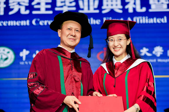 Professor Kuang Ming, Vice President of the First Affiliated Hospital, read the graduation precept written by Dr. Sun Yat-sen, and announced the university’s decision of conferring master’s and doctoral degrees. The Hospital’s President Xiao Haipeng presented the degree certificate to every graduate and delivered a speech. He said that graduation was not an end but a new starting point, and the students would start a new journey in their lives. He hoped the graduates would live up to the trust, fulfill the commission, and make contributions to the “Healthy China” strategy and the realization of the Chinese dream.
