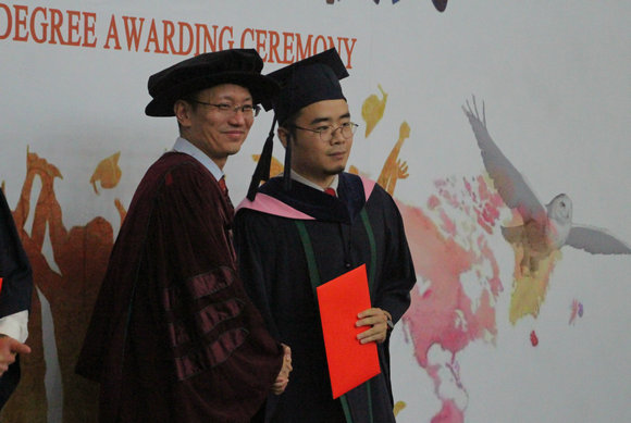 Professor Chen Jianhong presenting the graduation booklet to the graduate