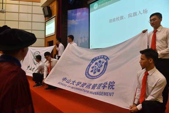 The first item on the agenda was to welcome the Sun Yat-sen University Flag and the School of Information Management Flag. The supervisor representatives took their seats on the stage. All rose and sang the national anthem.